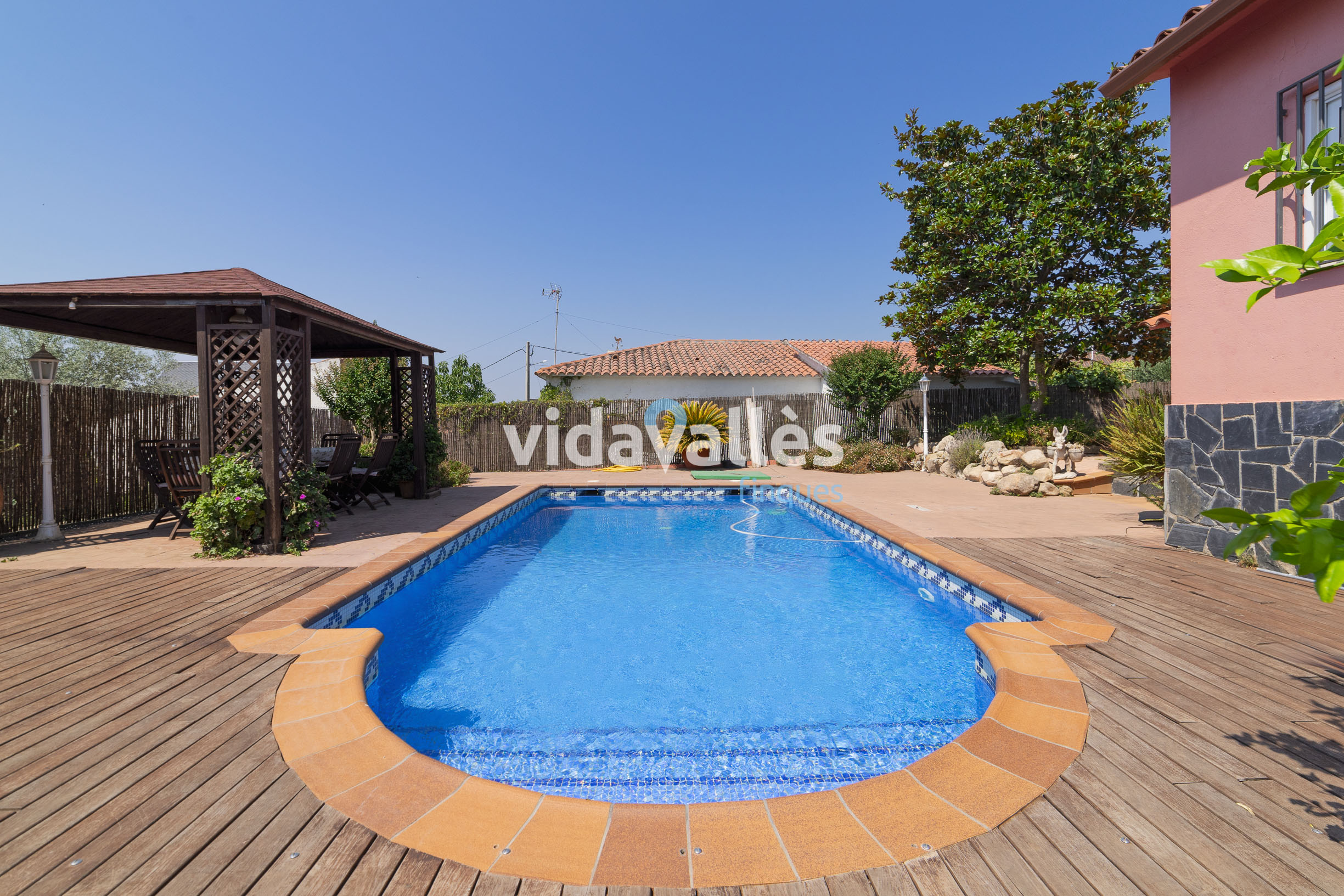 El espacio exterior combina zonas de césped, árboles y plantas con superficies pavimentadas con racholas antideslizantes, que hacen más cómodo el mantenimiento. La zona de piscina cuenta con un espacio de madera de teca alrededor y una carpa de madera que aporta sombra y un ambiente agradable para disfrutar al aire libre.
