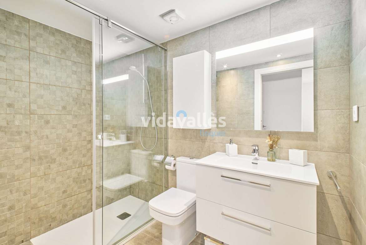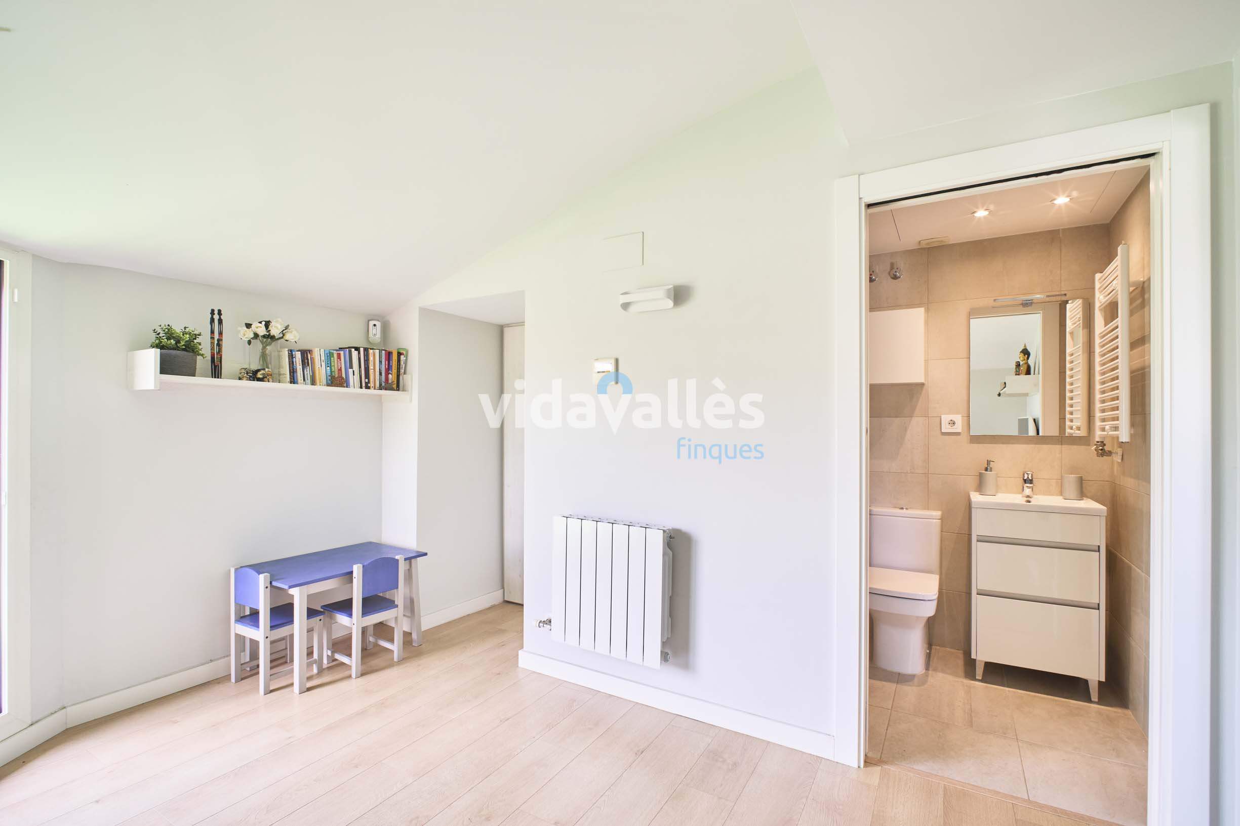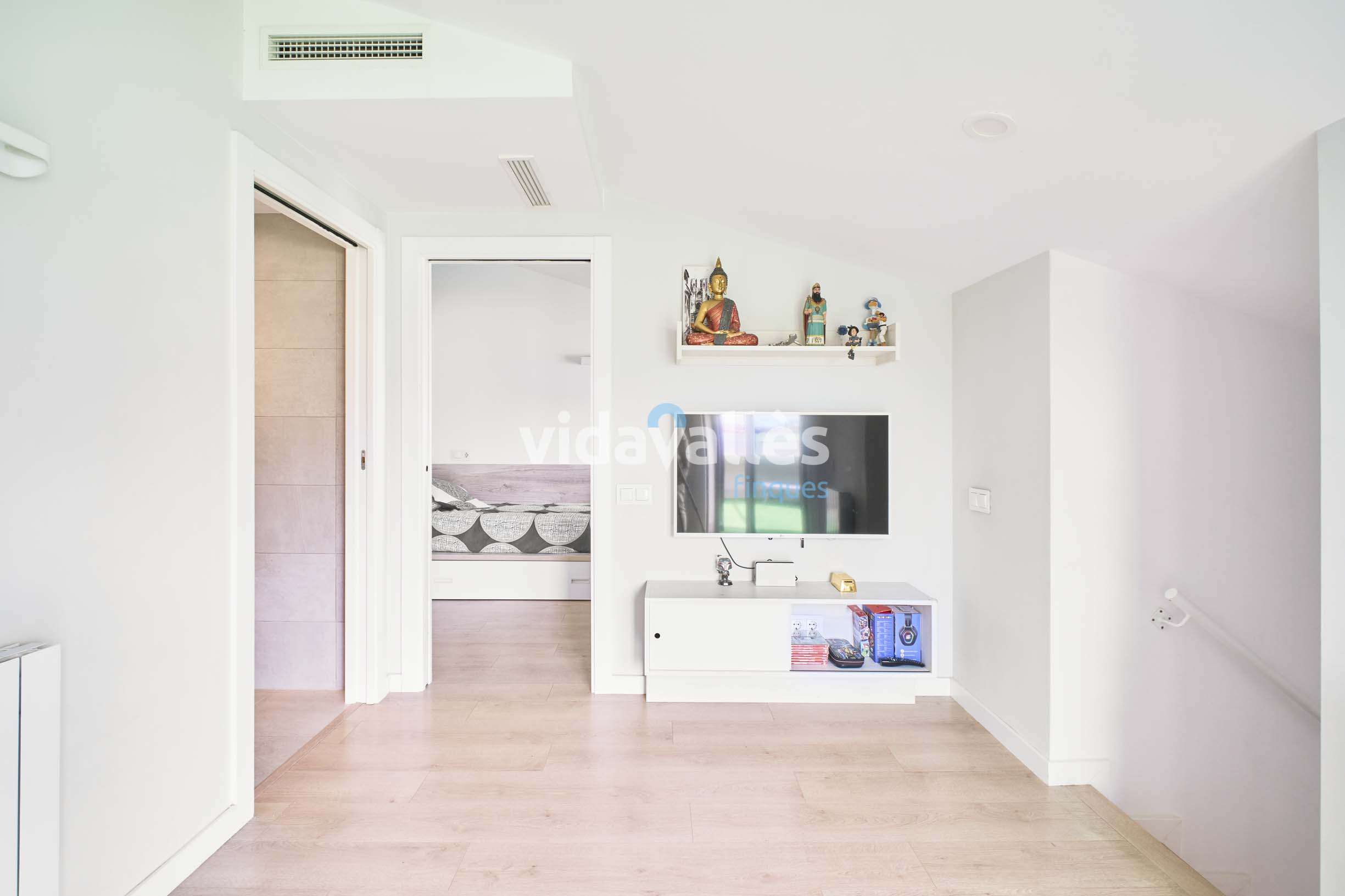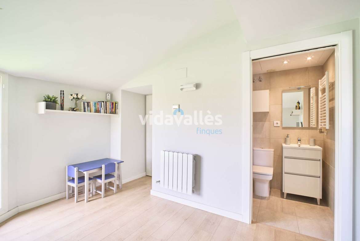 En la planta superior, la vivienda ofrece una zona polivalente que puede adaptarse a diversas necesidades, como un estudio o sala de juegos. También hay un tercer baño completo con ducha y una habitación individual con acceso a una segunda terraza de 9 m². La terraza principal esquinera, de 25 m², está equipada con toldo a medida, lo que la convierte en un lugar perfecto para relajarse mientras disfrutas de las vistas al Montseny y al Corredor.