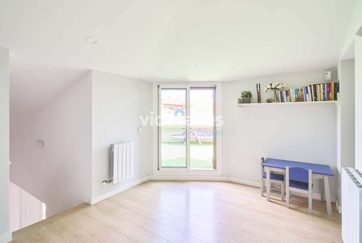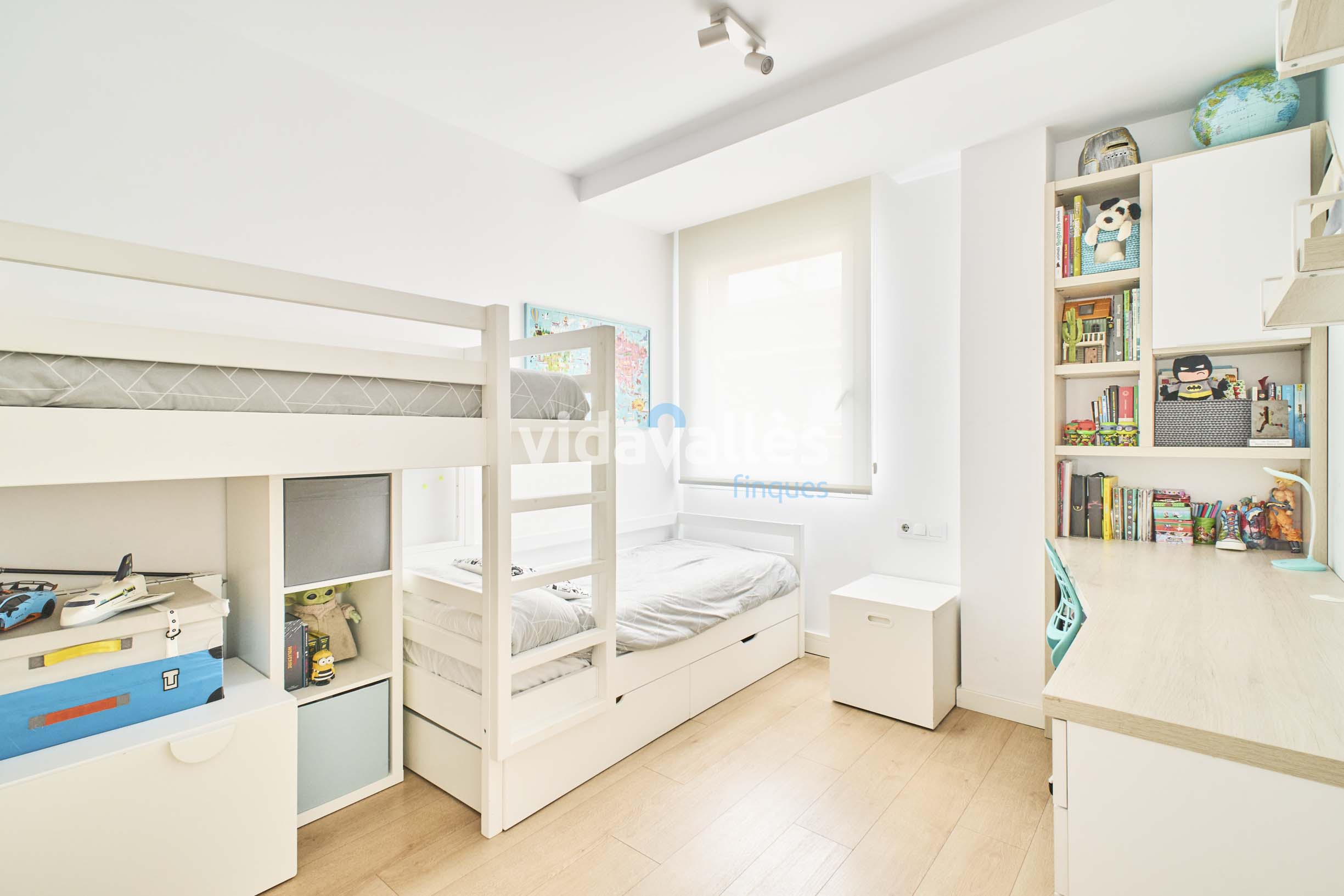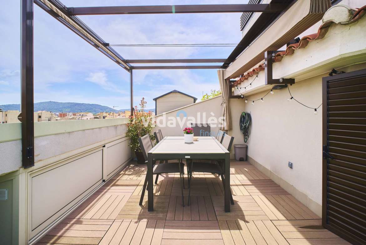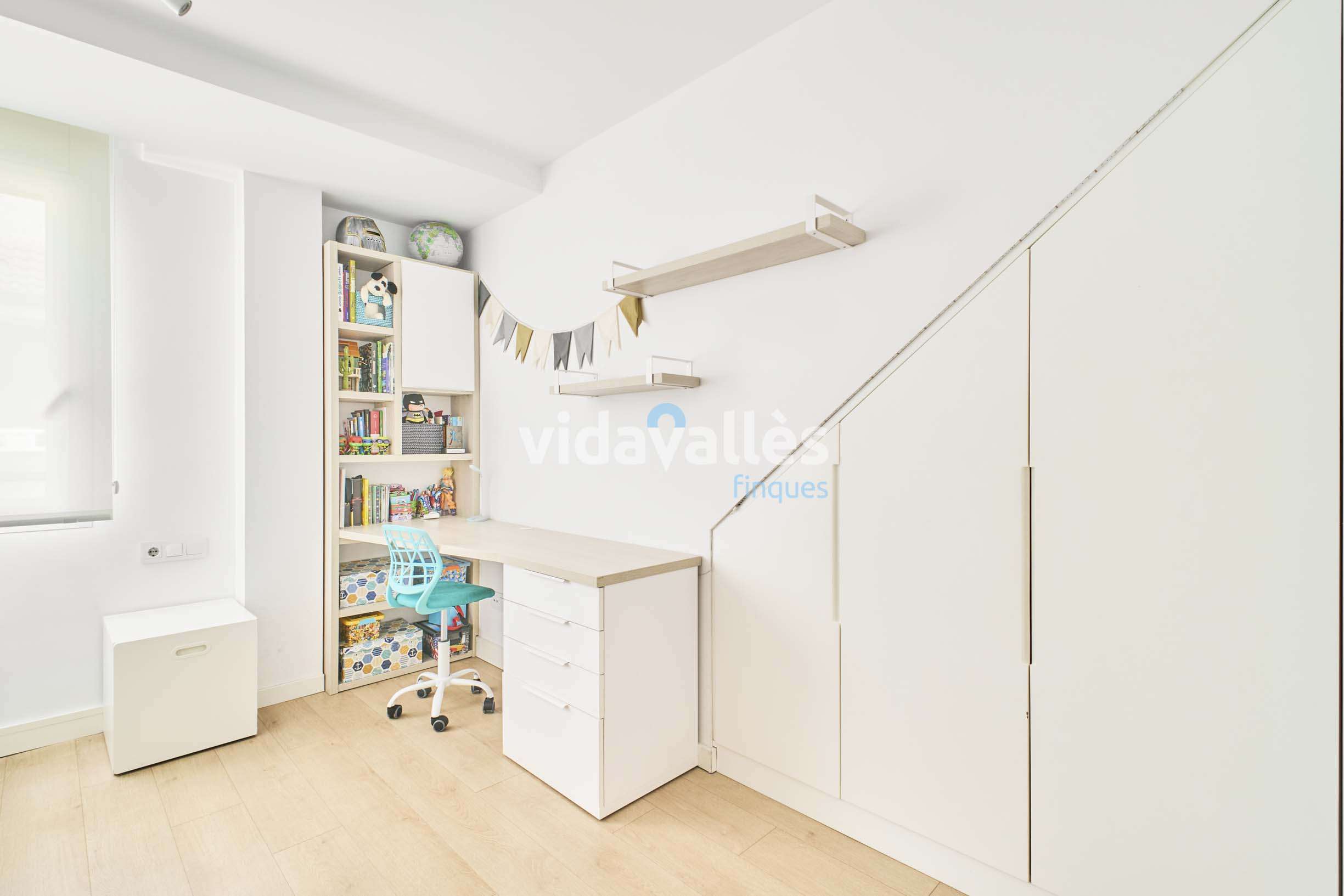 En la planta superior, la vivienda ofrece una zona polivalente que puede adaptarse a diversas necesidades, como un estudio o sala de juegos. También hay un tercer baño completo con ducha y una habitación individual con acceso a una segunda terraza de 9 m². La terraza principal esquinera, de 25 m², está equipada con toldo a medida, lo que la convierte en un lugar perfecto para relajarse mientras disfrutas de las vistas al Montseny y al Corredor.