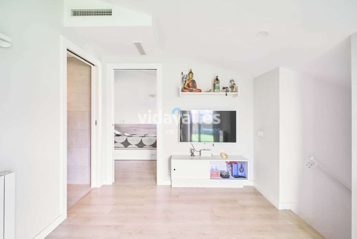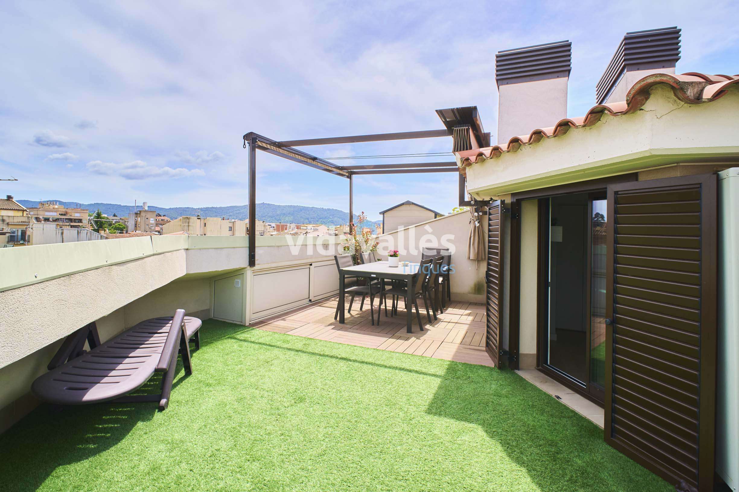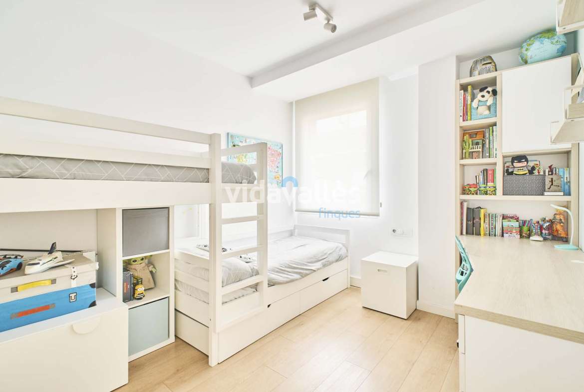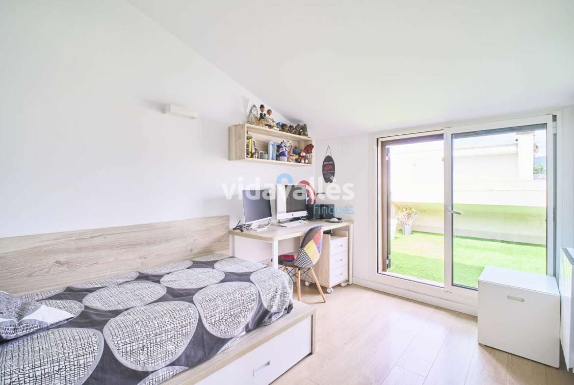En la planta superior, la vivienda ofrece una zona polivalente que puede adaptarse a diversas necesidades, como un estudio o sala de juegos. También hay un tercer baño completo con ducha y una habitación individual con acceso a una segunda terraza de 9 m². La terraza principal esquinera, de 25 m², está equipada con toldo a medida, lo que la convierte en un lugar perfecto para relajarse mientras disfrutas de las vistas al Montseny y al Corredor.